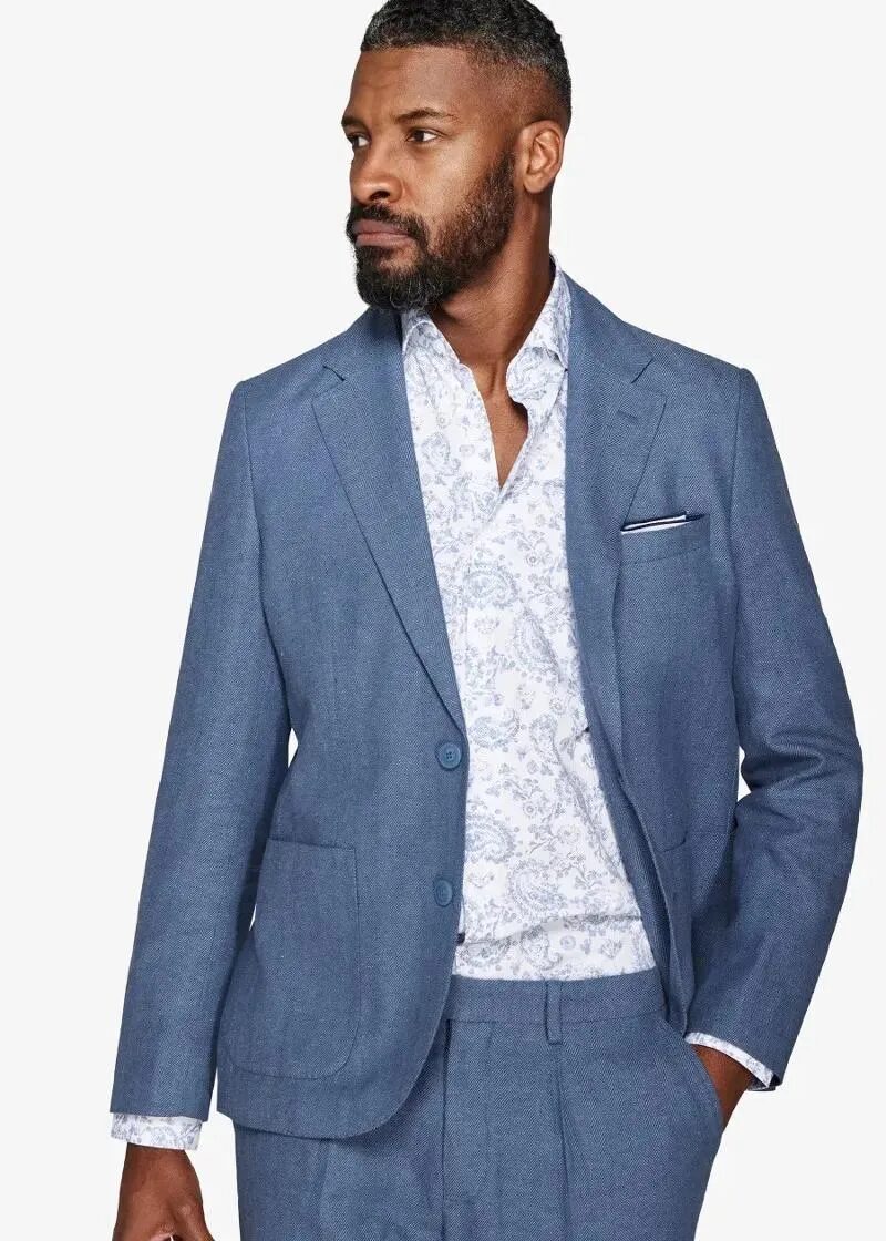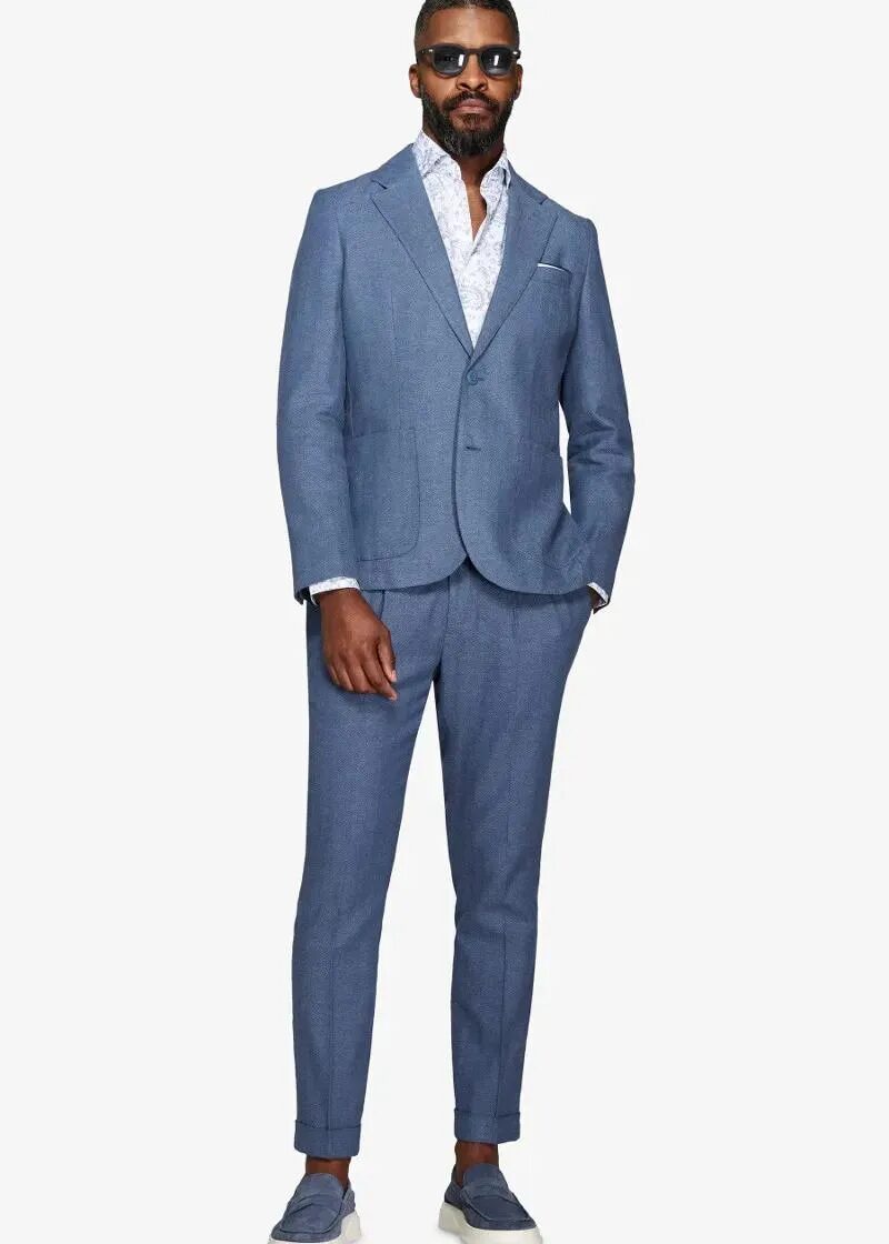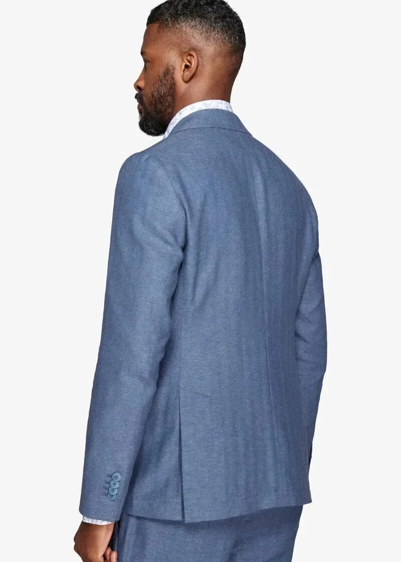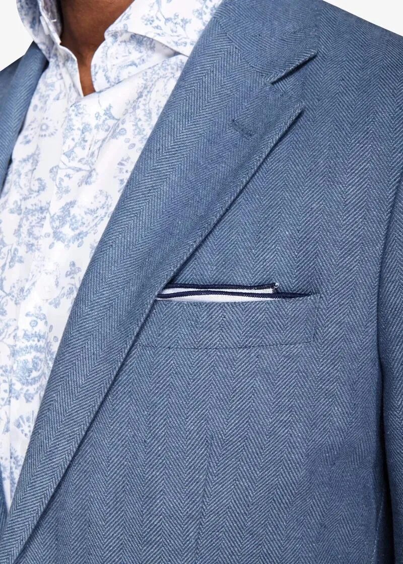 Sako sa dezenom riblje kosti izrađen od mešavine pamuka i lana. Avion plava boja daje moderan i svež izgled. Slim fit kroj, model Condotti, drop 7. Klasični reveri, kopčanje na dva dugmeta i našiveni džepovi. Delimično postavljen za dodatnu udobnost i strukturu.