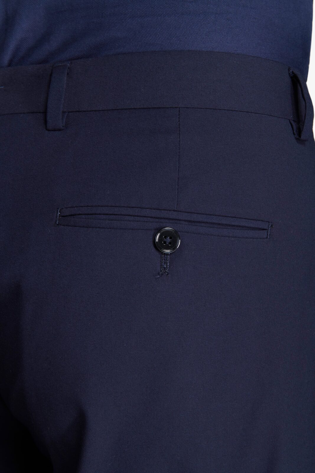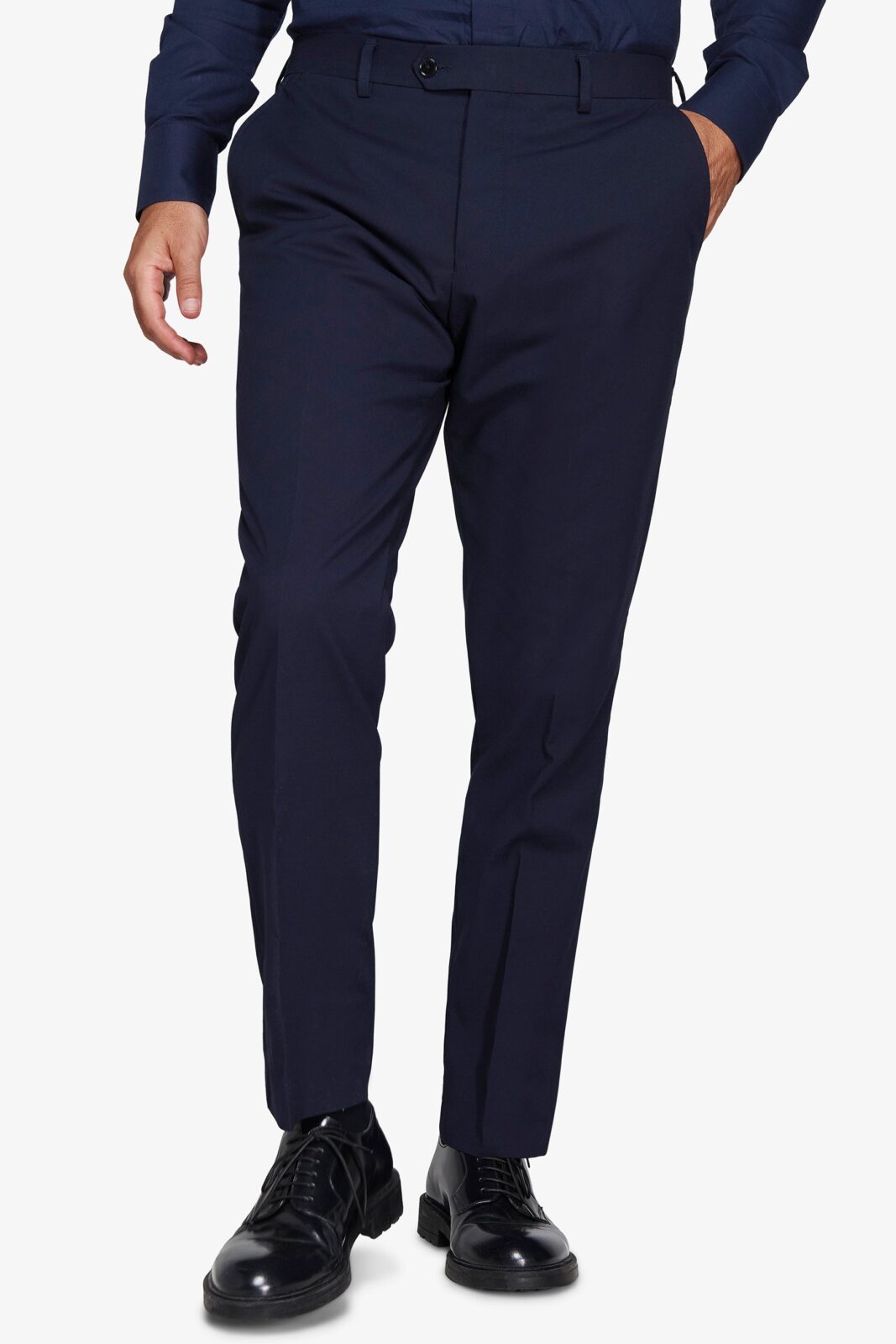 Klasične pantalone za odelo u jednobojnoj crnoj boji. Slim kroj sa kosim džepovima. Bez faltni, sa pojasom sa jezičkom i gajkama za kaiš.