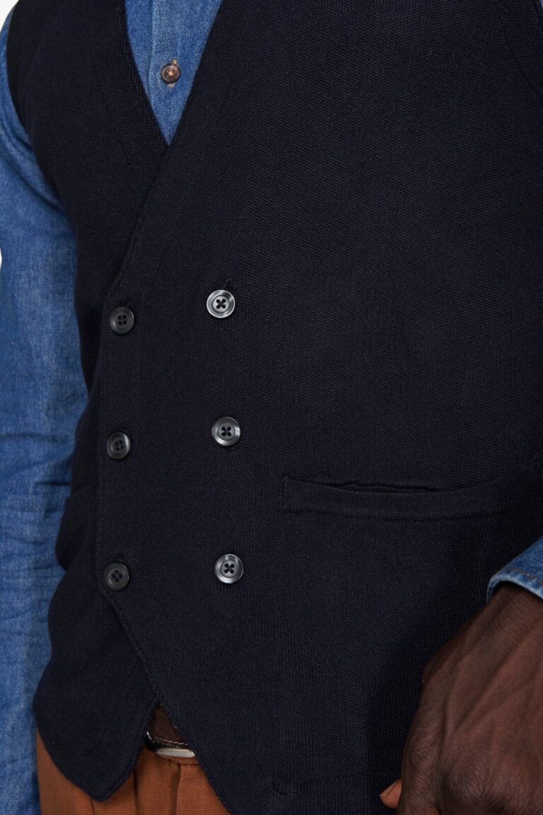 Elegantan dvoredni prsluk u plavoj nijansi izrađen od fine pletene strukture (12-gauge) donosi sofisticiran i moderan izgled. Klasičan dizajn sa usklađenim dugmadima čini ga idealnim dodatkom za formalne i smart casual kombinacije.