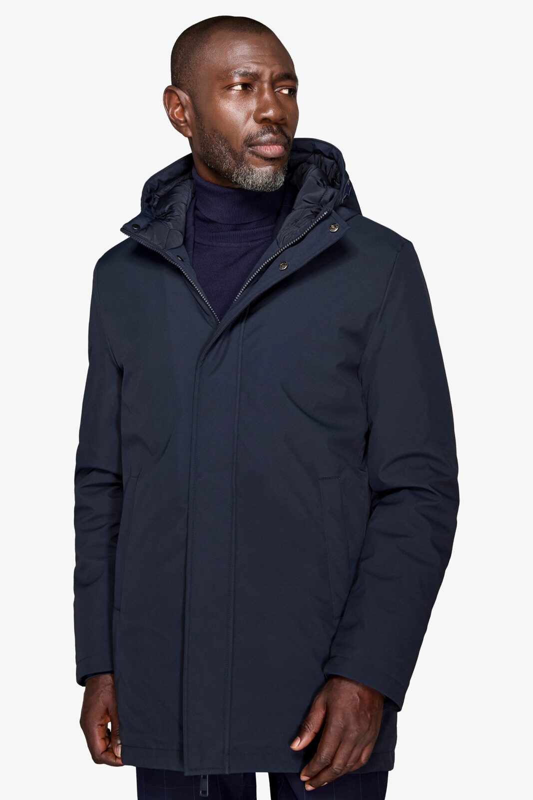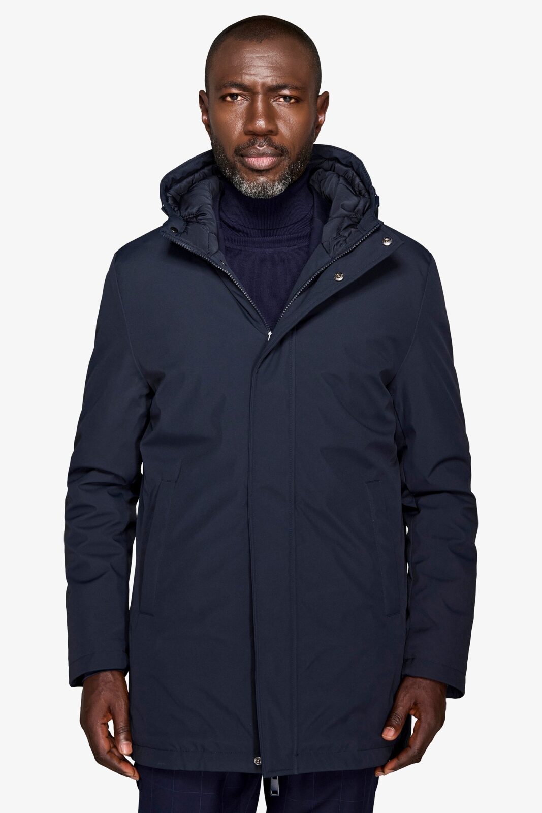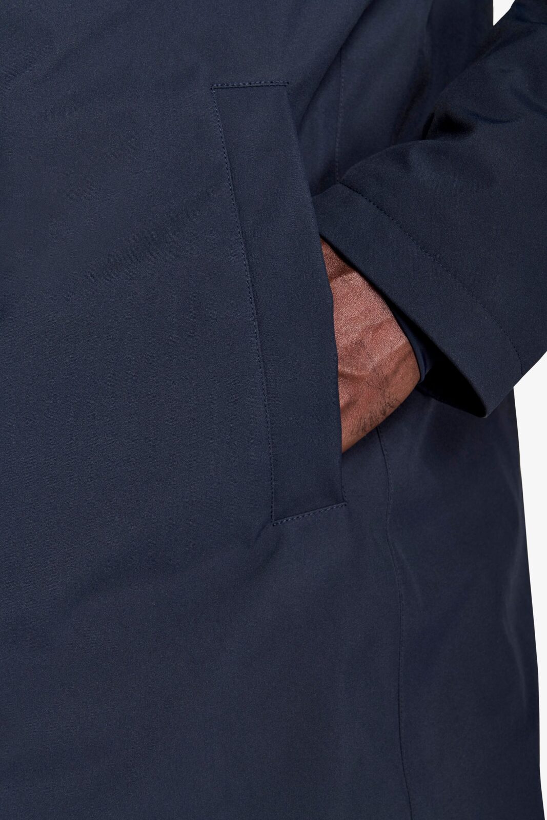Moderan duži peacoat kaput u plavoj nijansi izrađen od tehničkog materijala pruža zaštitu i sofisticiran izgled tokom hladnijih dana. Minimalistički dizajn sa skrivenim rajsferšlusom daje mu čist i elegantan izgled, idealan za svakodnevne i poslovne kombinacije.