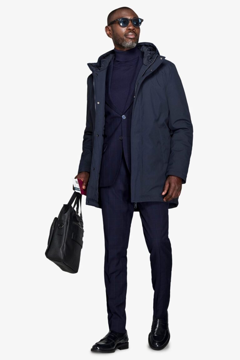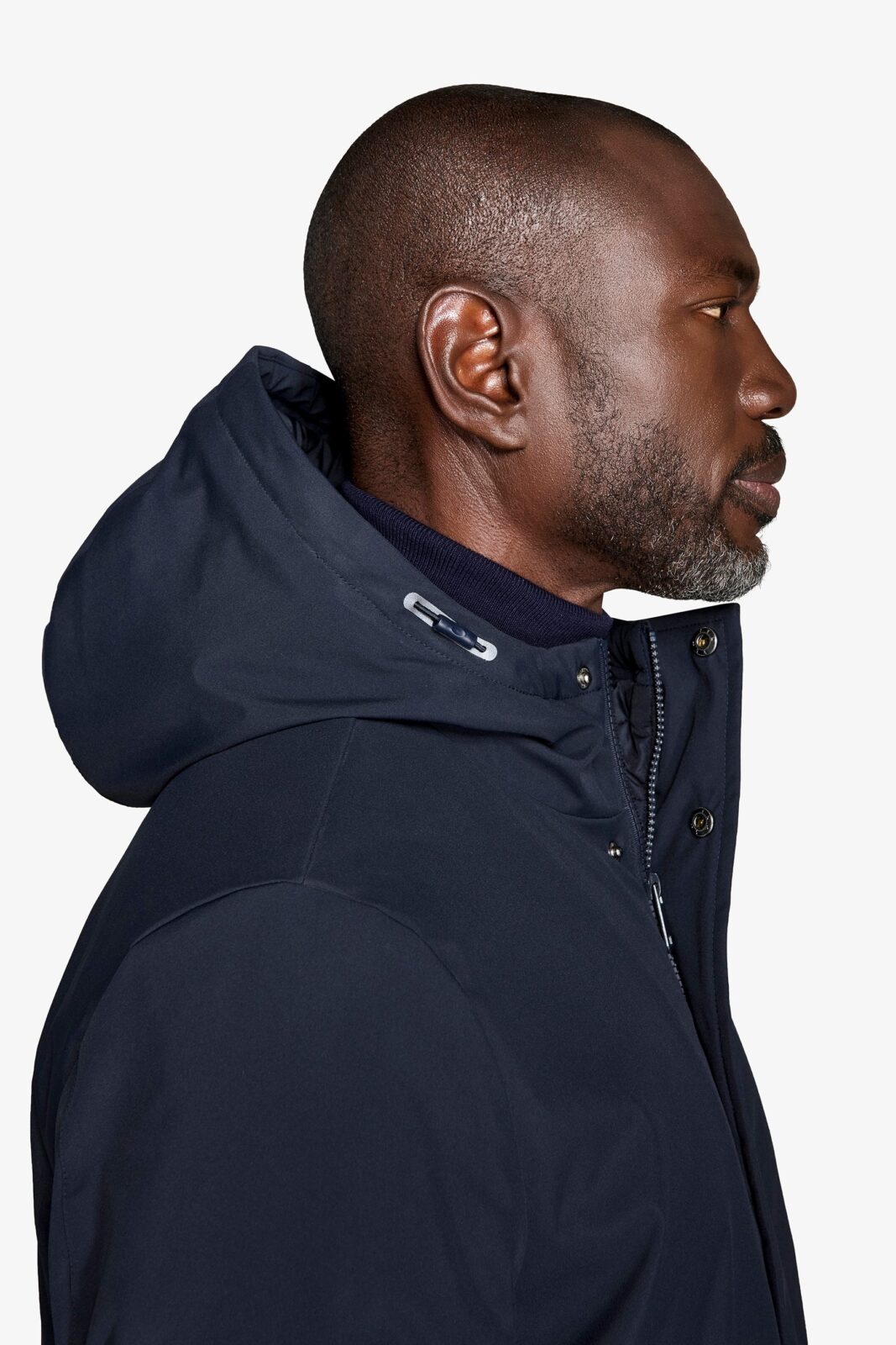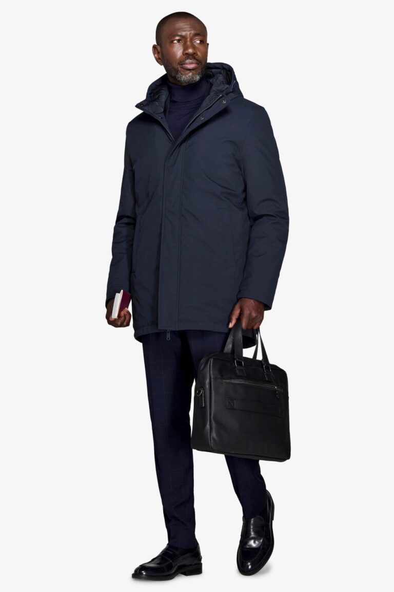 Moderan duži peacoat kaput u plavoj nijansi izrađen od tehničkog materijala pruža zaštitu i sofisticiran izgled tokom hladnijih dana. Minimalistički dizajn sa skrivenim rajsferšlusom daje mu čist i elegantan izgled, idealan za svakodnevne i poslovne kombinacije.