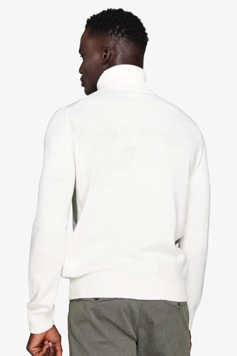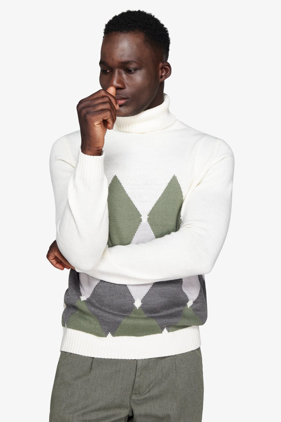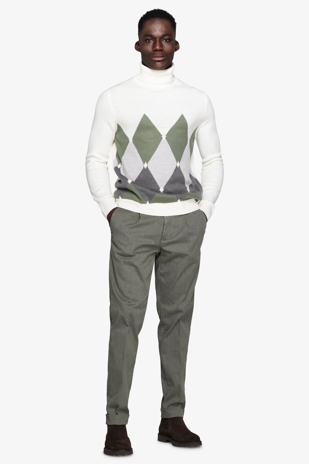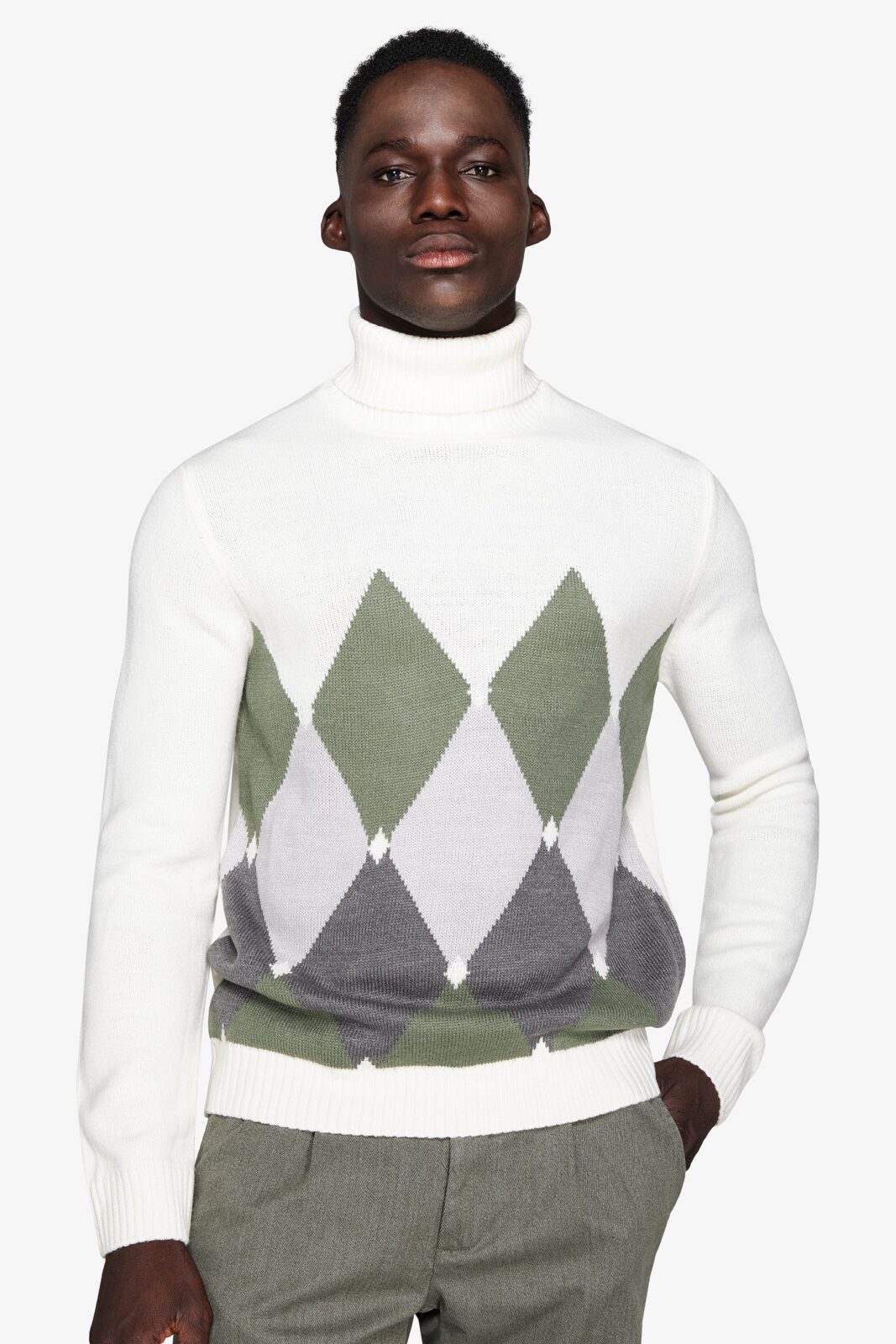 Rolka sa visokim okovratnikom i intarzija romb dezena, sa kontrastnim detaljima. Slim fit kroj daje moderan i elegantan izgled.