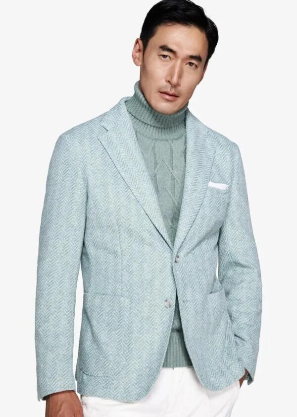 Dekonstruisani sako od bojenog pamuka. Slim kroj sa špicastim reverima. Kopčanje na dva dugmeta i našiveni džepovi.