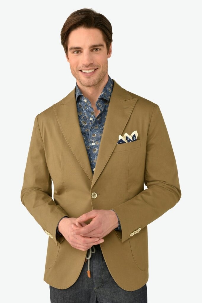 Dekonstruisani sako od bojenog pamuka. Slim kroj sa špicastim reverima. Kopčanje na dva dugmeta i našiveni džepovi.