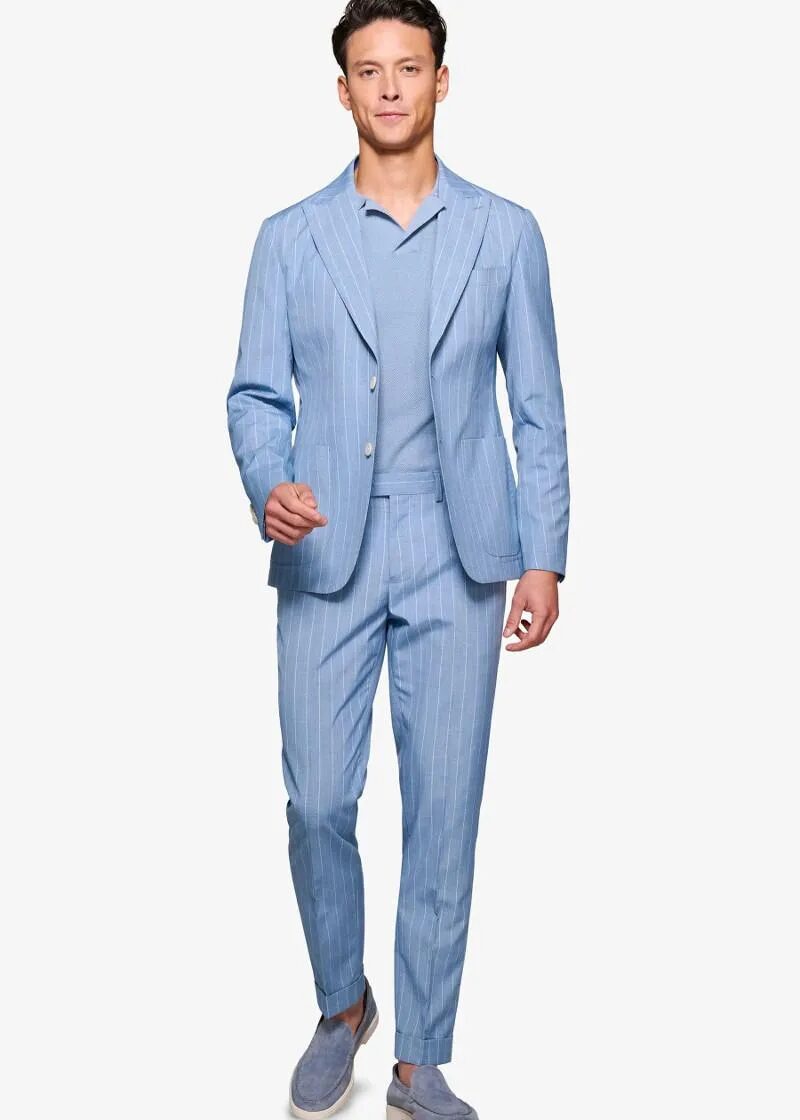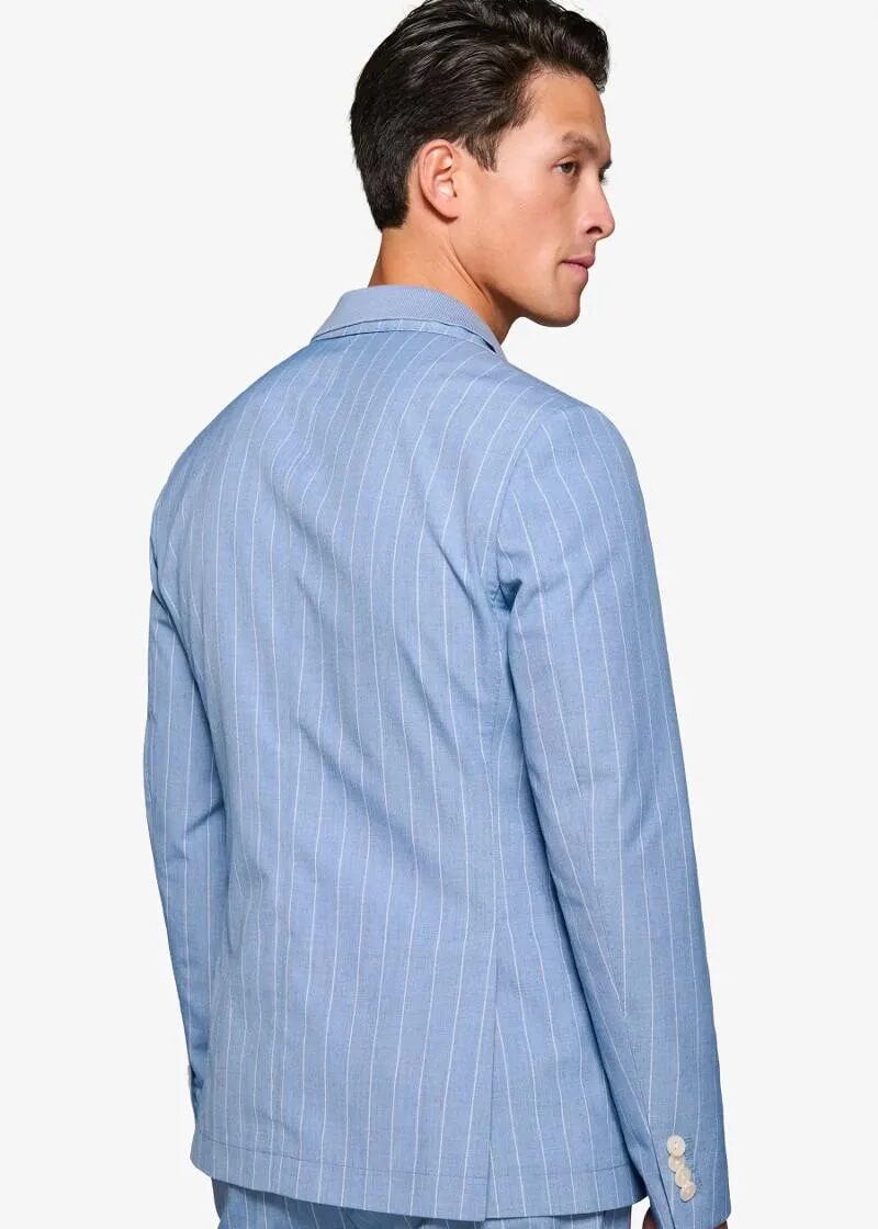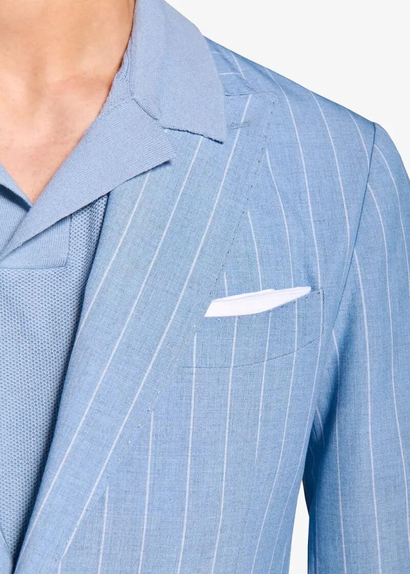 Sako sa gessato (prugastim) melanž dezenom. Slim kroj sa špicastim reverima. Kopčanje na dva dugmeta i džepovi sa preklopom. Dekonstruisane izrade i bez postave.