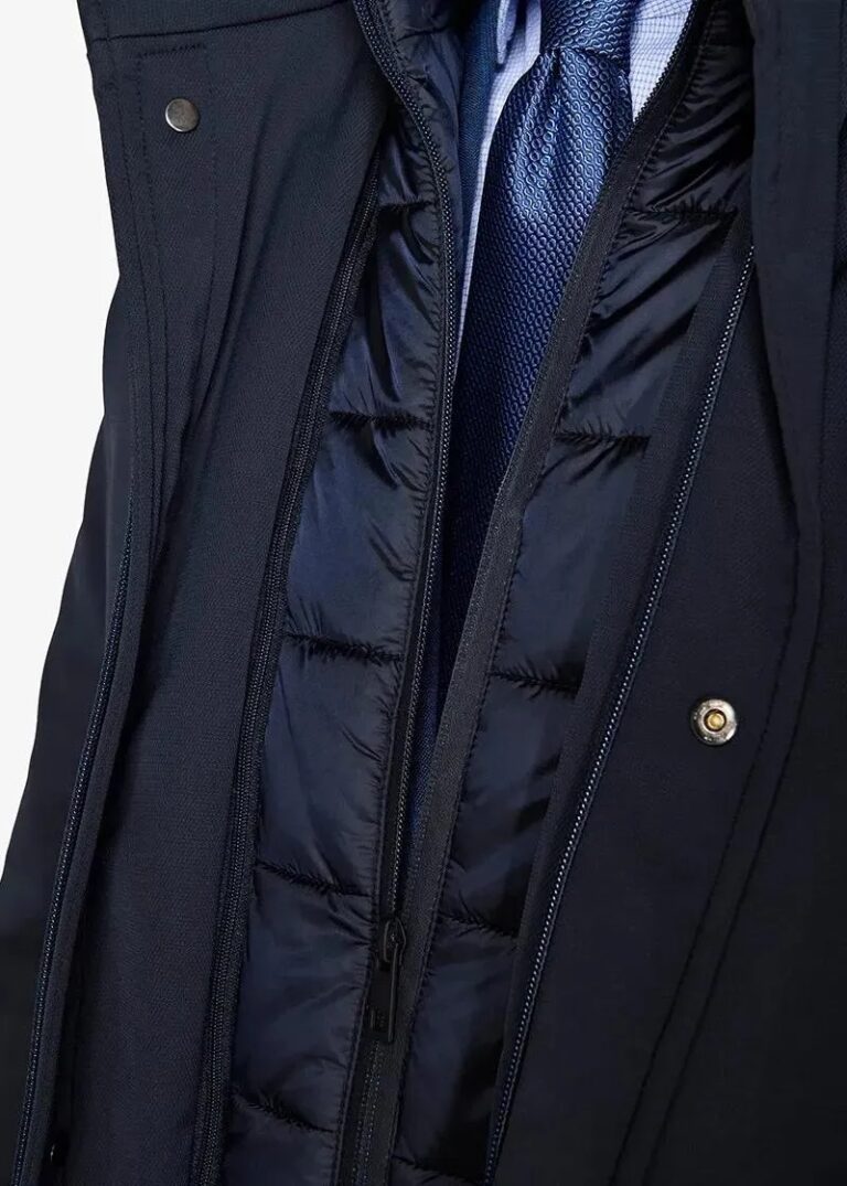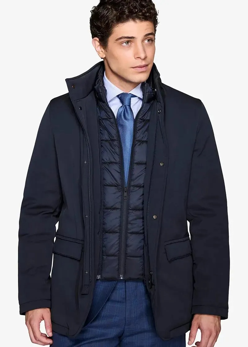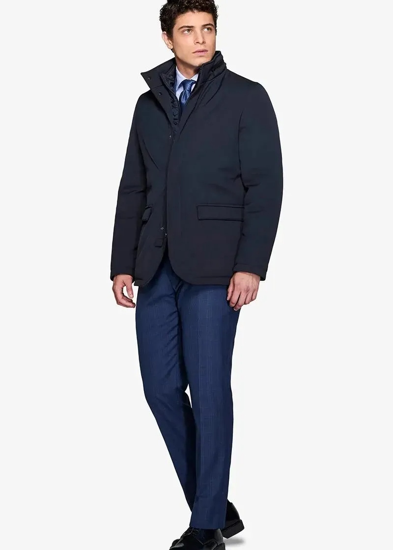 Funkcionalna teget jakna sa unutrašnjim umetkom pruža dodatnu toplinu i udobnost tokom hladnijih dana, uz zadržan elegantan i uredan spoljašnji izgled. Slojeviti dizajn omogućava moderan stil i praktičnost u svakodnevnim i poslovnim kombinacijama.