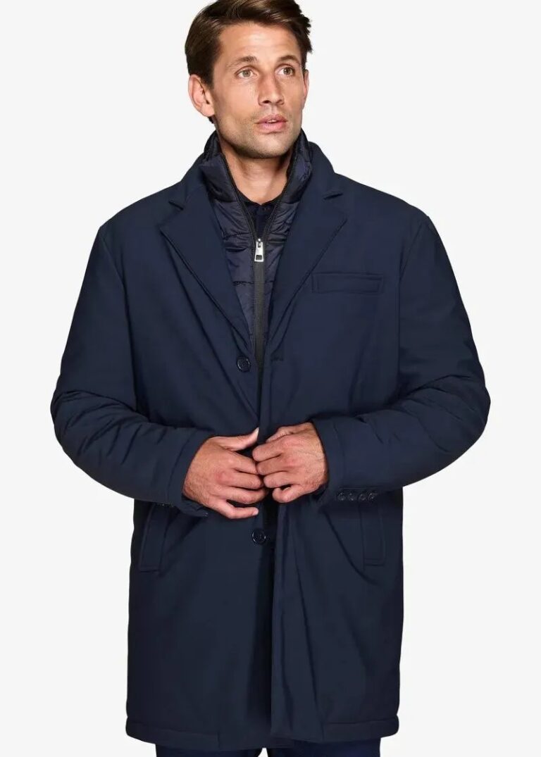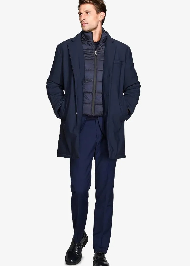 Moderan teget kaput-jakna donosi spoj elegancije i funkcionalnosti, idealan za hladnije dane. Klasičan spoljašnji izgled sa reverima kombinuje se sa praktičnim unutrašnjim uloškom sa rajsferšlusom, koji pruža dodatnu toplinu i zaštitu.