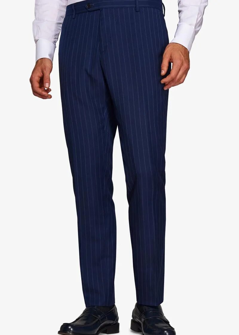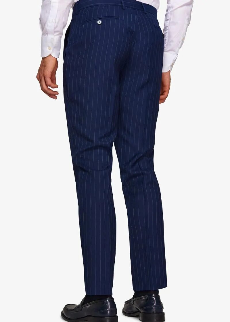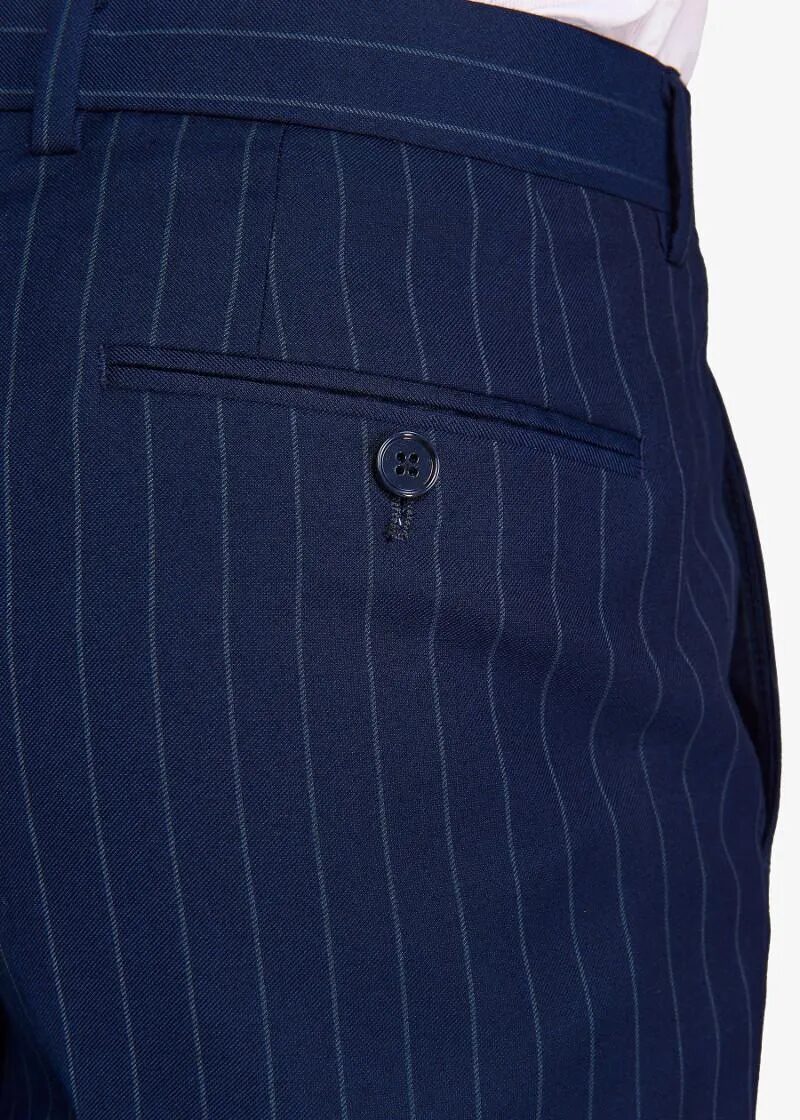 Elegantne muške pantalone u tamnoplavoj boji sa diskretnim vertikalnim prugama predstavljaju klasičan izbor za poslovne i formalne kombinacije. Vertikalne pruge vizuelno izdužuju siluetu i daju sofisticiran, uredan izgled. Model je krojen u slim fit stilu koji prati liniju tela i pruža moderan izgled, dok klasičan pojas sa gajkama za kaiš i praktični džepovi doprinose funkcionalnosti. Ove pantalone se lako kombinuju uz košulju i sako za elegantan poslovni stil ili uz lagani džemper za smart-casual kombinacije. Kroj: Slim fit Sastav: 98% poliester 2% viskoza