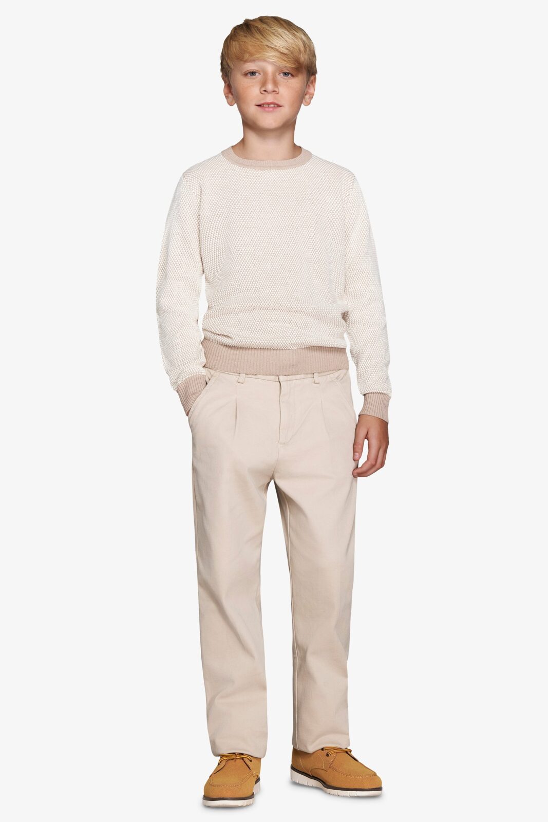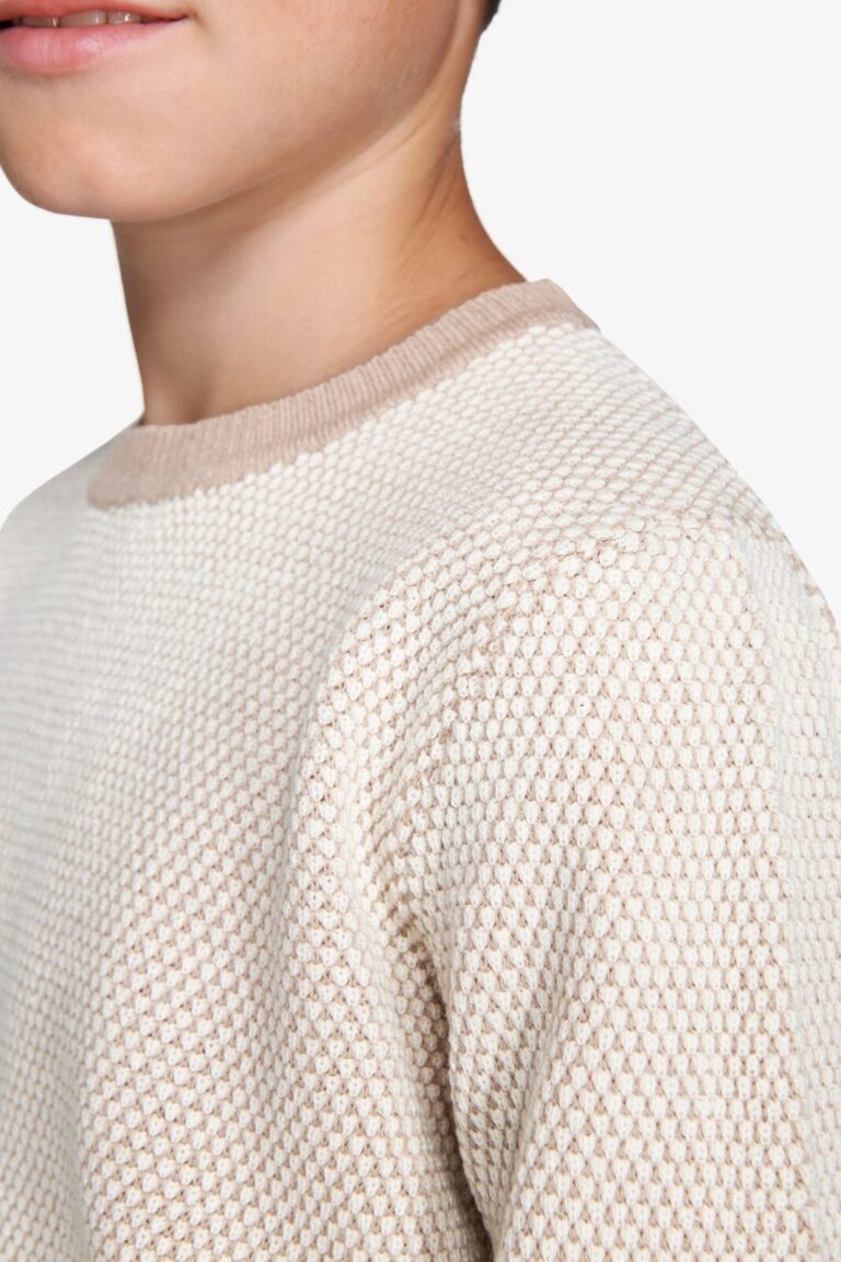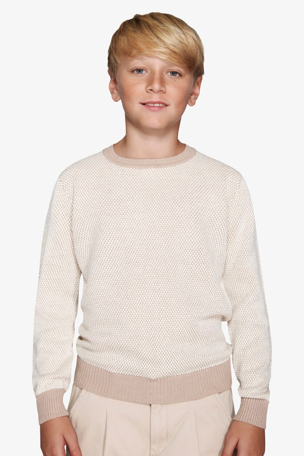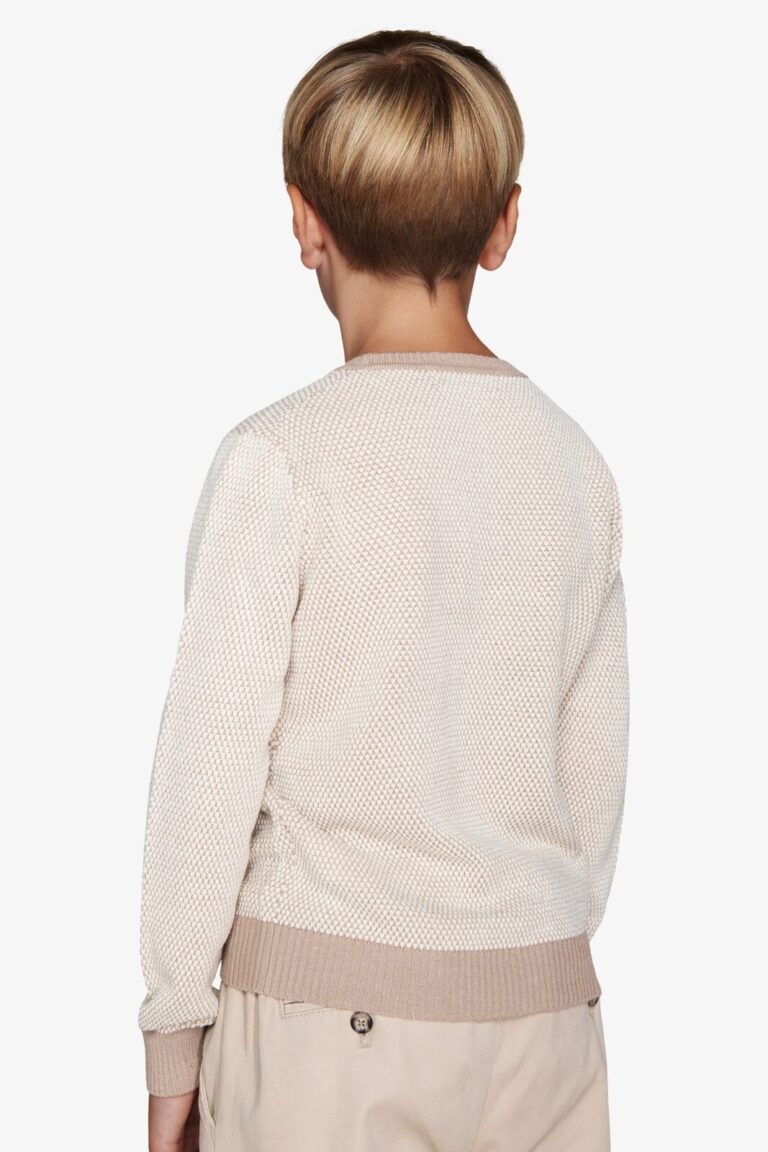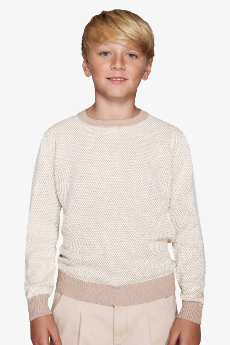 Dečiji džemper sa okruglim izrezom izrađen u dvobojnom rice stitch pletivu koje daje zanimljivu teksturu i moderan izgled. Kontrastni rebrasti završeci na kragni, rukavima i donjem delu dodatno ističu dizajn. Udoban i praktičan model za svakodnevno nošenje, sa toplinom i mekoćom idealnom za hladnije dane. Sastav: 70% akril 20% vuna 10% pamuk